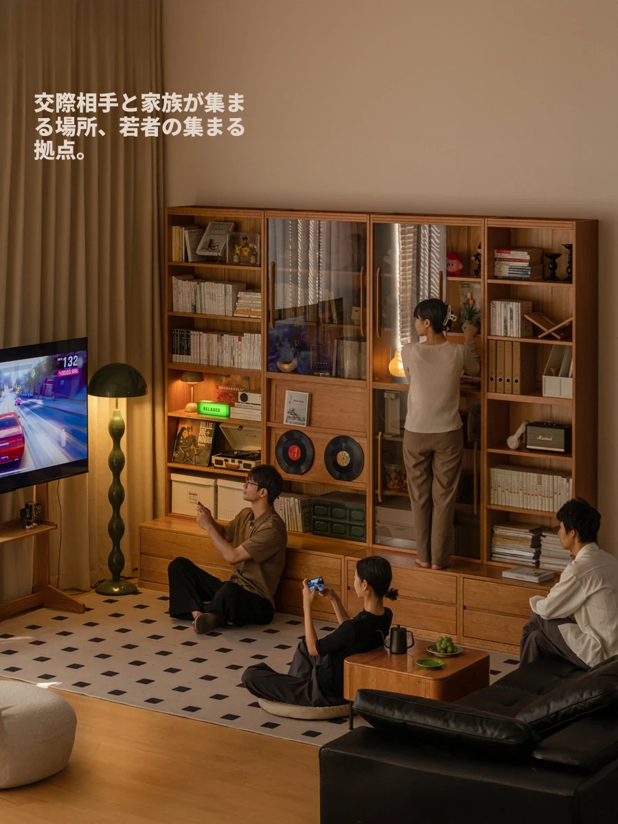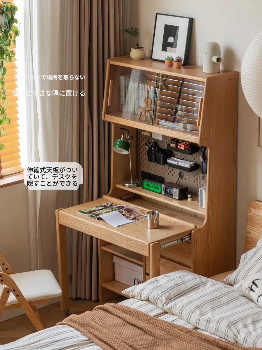 源氏木語の無垢材書棚 - モダンでシンプルな伸縮式デスク一体型収納キャビネット | おしゃれなオーク製、書斎や家庭に最適な収納ソリューション!