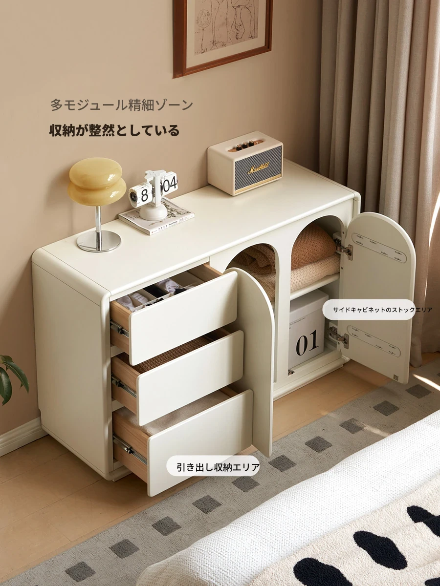 源氏木語の無垢材キャビネット|フランス風クリームホワイトの引出しサイドキャビネット|寝室収納に最適|おしゃれで機能的なホワイト収納家具