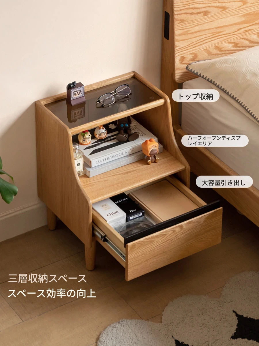 源氏木语 新作!高級感溢れる無垢材のベッドサイドテーブル 小型ガラスデザイン 家庭向け おしゃれな収納力抜群の寝室用キャビネット【小さなお部屋にもぴったり!】