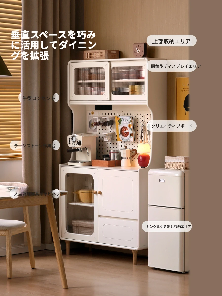 源氏木語の無垢材トレンド岩板サイドボード - おしゃれなクリーム色でキッチンをスタイリッシュに収納!シンプルなデザインで、便利さと美しさを両立させた一体型ストレージキャビネット。あなたのダイニングを格上げします!