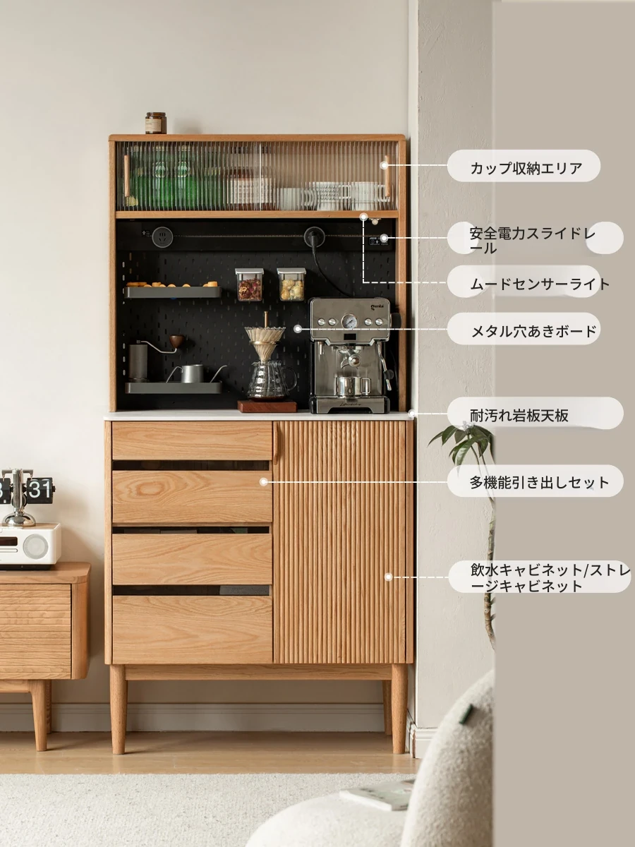 源氏木语 ナチュラル無垢材 北欧スタイル ダイニングサイドボード オーク製 ボウルキャビネット 家庭用 モダンミニマリスト 収納キャビネット お茶・飲み物収納に最適!