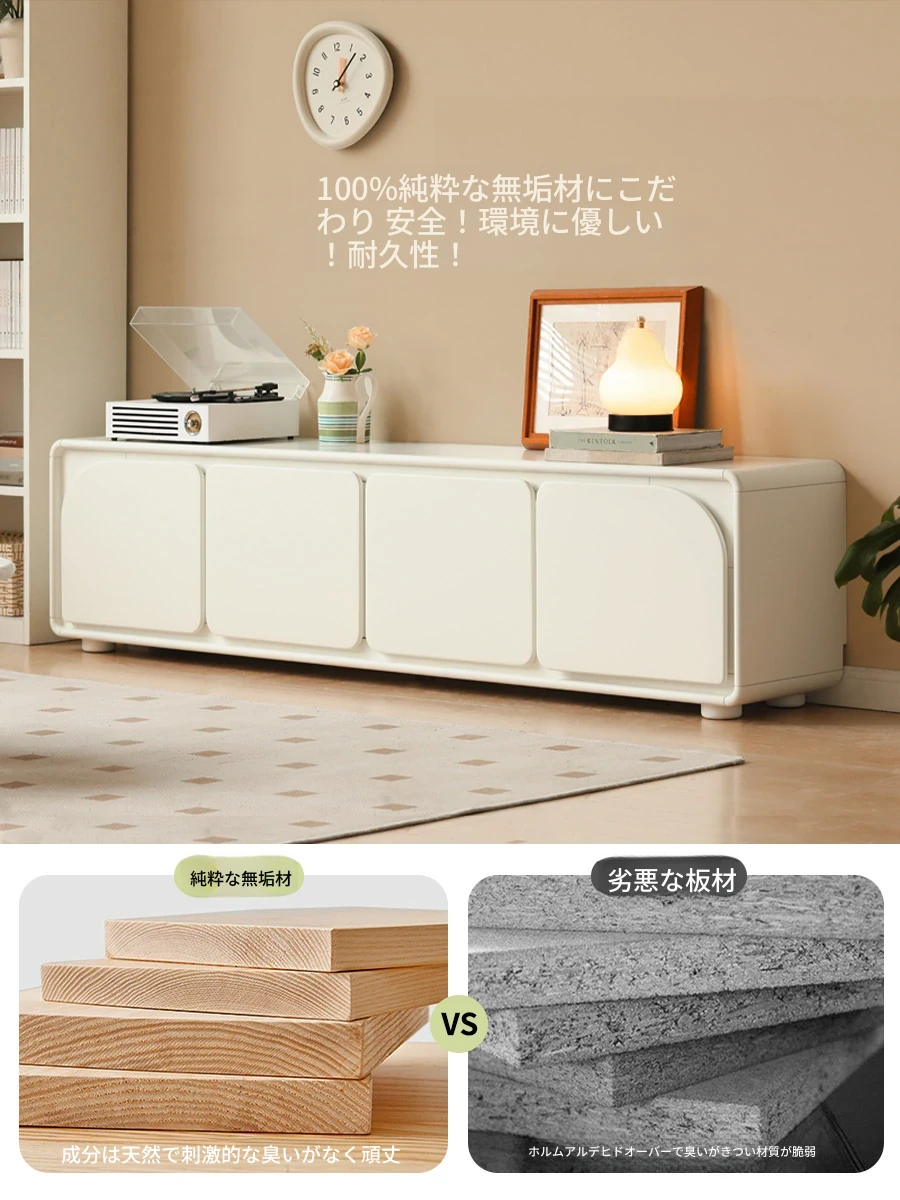 源氏木语の無垢材テレビボード|リビングにぴったりなクリーム風デザイン|小さなお部屋にも最適なホワイトフロアキャビネット|収納力抜群でオシャレな空間を演出!