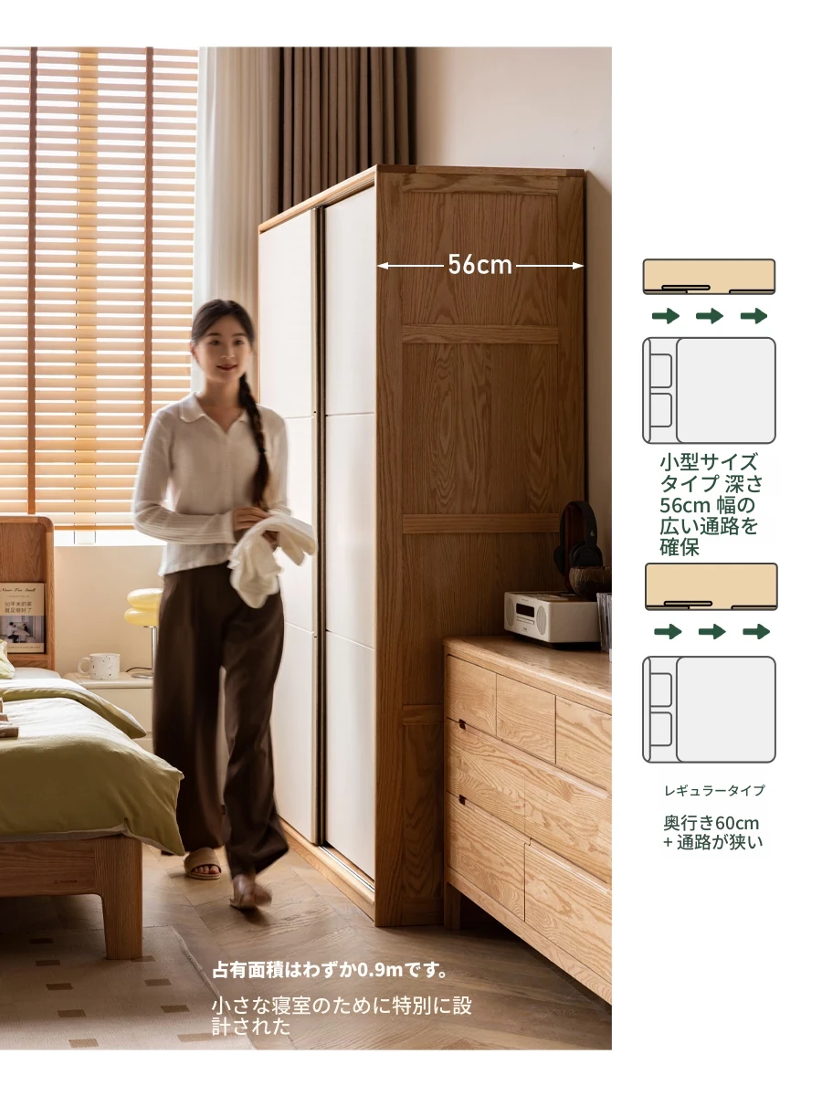 源氏木語の天然木使用!シンプルでスタイリッシュな主寝室用クローゼット。小スペースでもぴったりなオーク材のツートンカラー、スライドドア収納キャビネットでお部屋をおしゃれに!