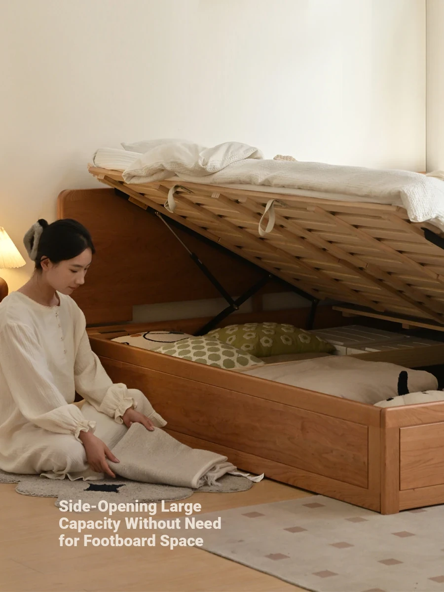 Genji Mu Yu Solid Wood Cherry Bed – Vintage Style Side-Opening Storage Bed with Gas Lift Mechanism for Bedroom, Perfect for Maximizing Space!