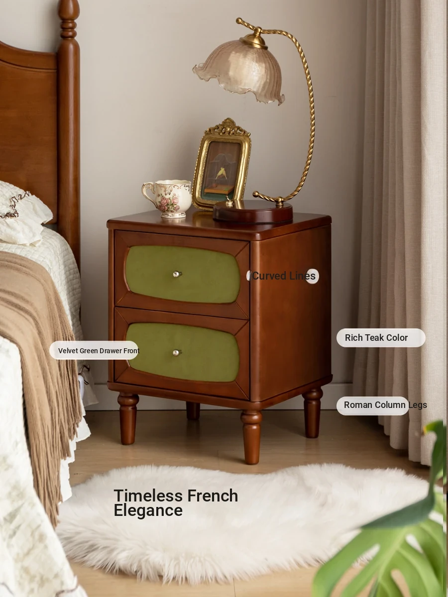 Genji Mu Yu Solid Wood Bedside Table - French Vintage Style Nightstand in Teak Color, Perfect for Home Storage and Bedroom Decor