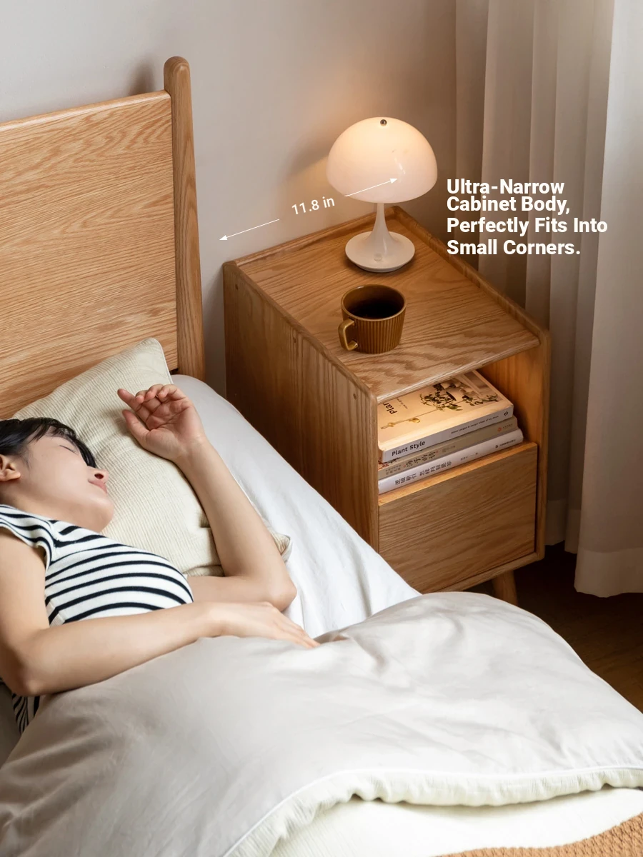 Genki Woodworks Ultra-Narrow Solid Wood Nightstand - Modern Minimalist Oak Storage Cabinet with LED Light for Bedroom, Multi-Functional Design & Stylish Organization Solutions.