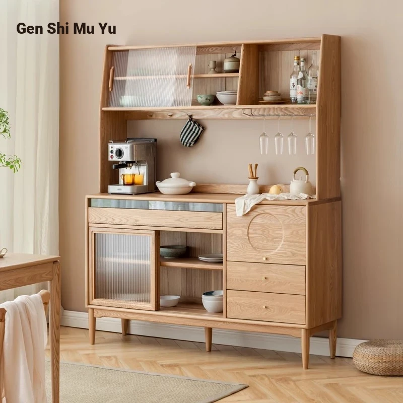 Genji Wood Solid Wood Sideboard - Creamy Finish, Minimalist Design for Home Dining, Multi-Functional Tea Cabinet with Glass Sliding Doors