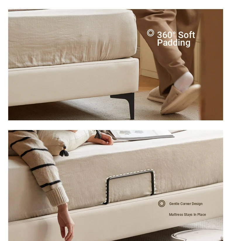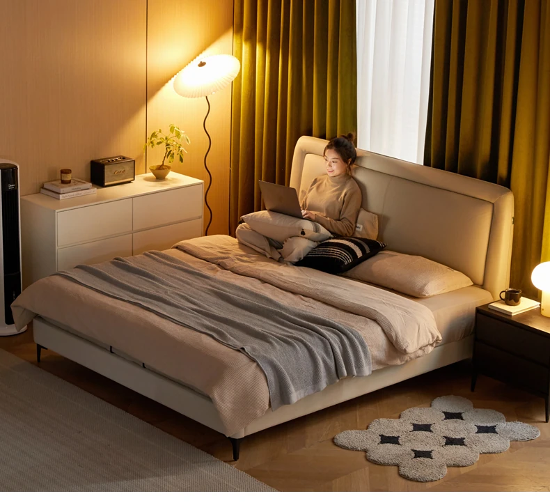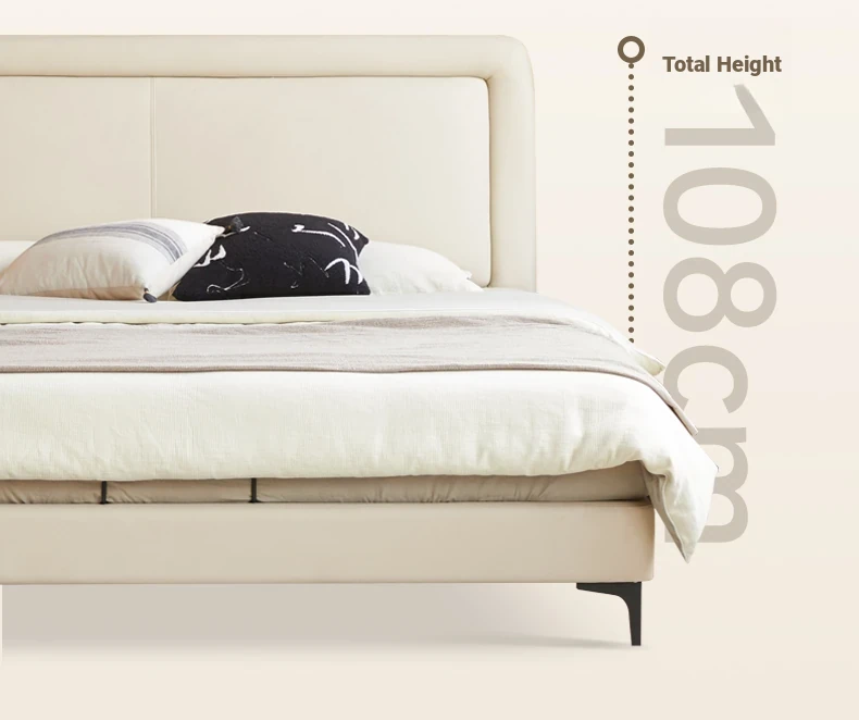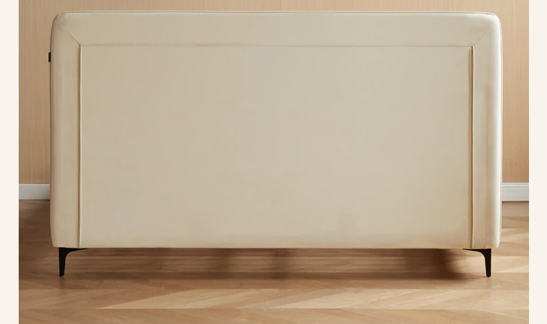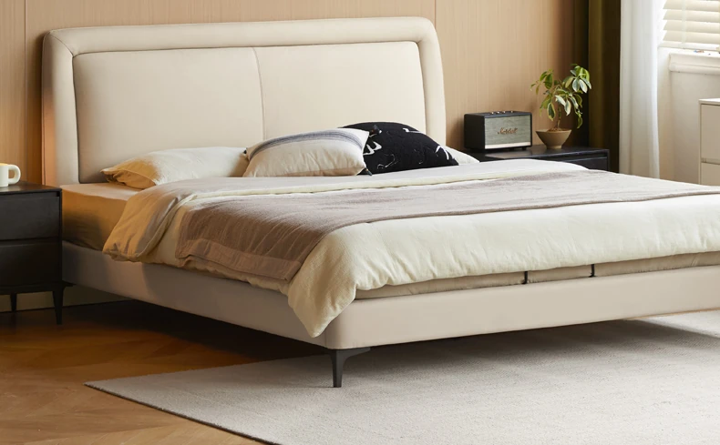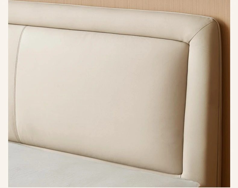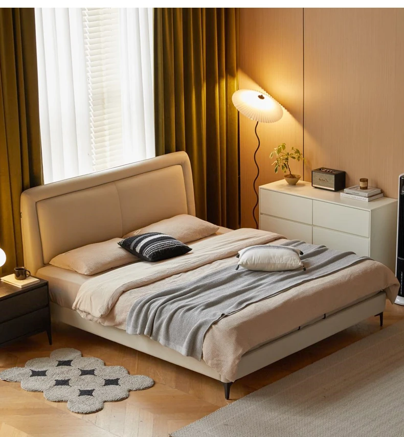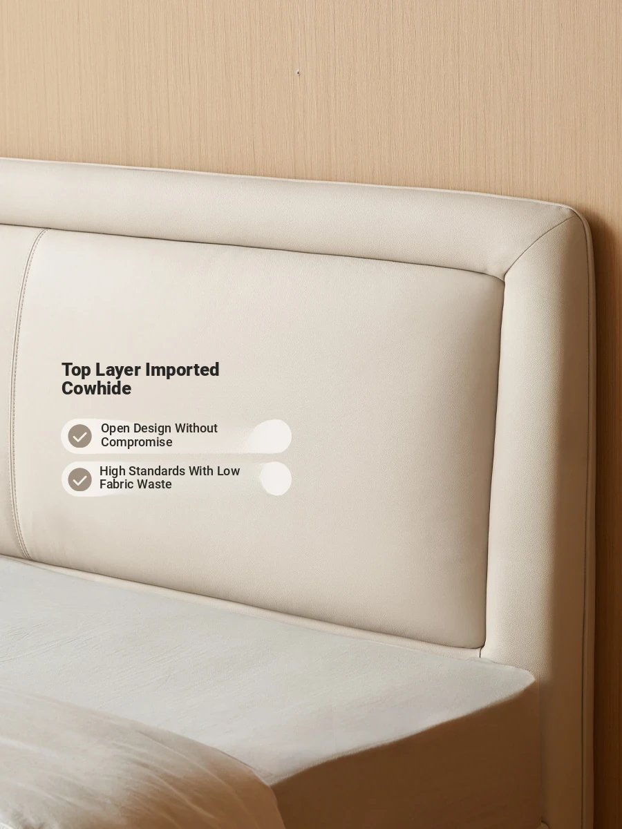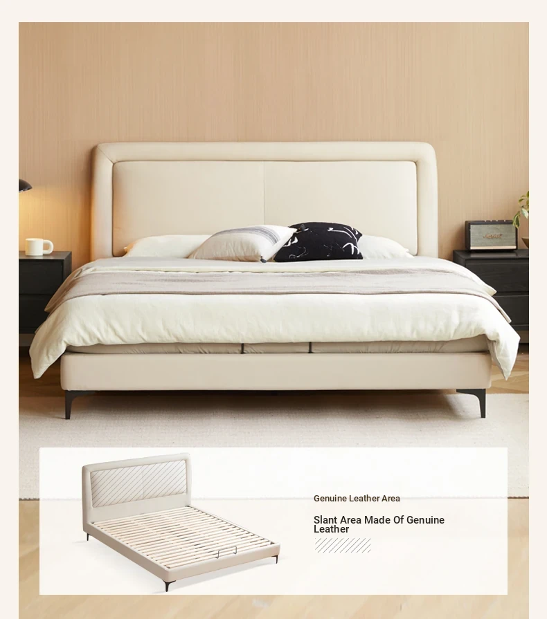 Genji Mu Yu Genuine Leather Modern Minimalist Queen Bed – Cream Upholstered Bed with White Border, Cowhide Double Bed for Stylish Bedrooms