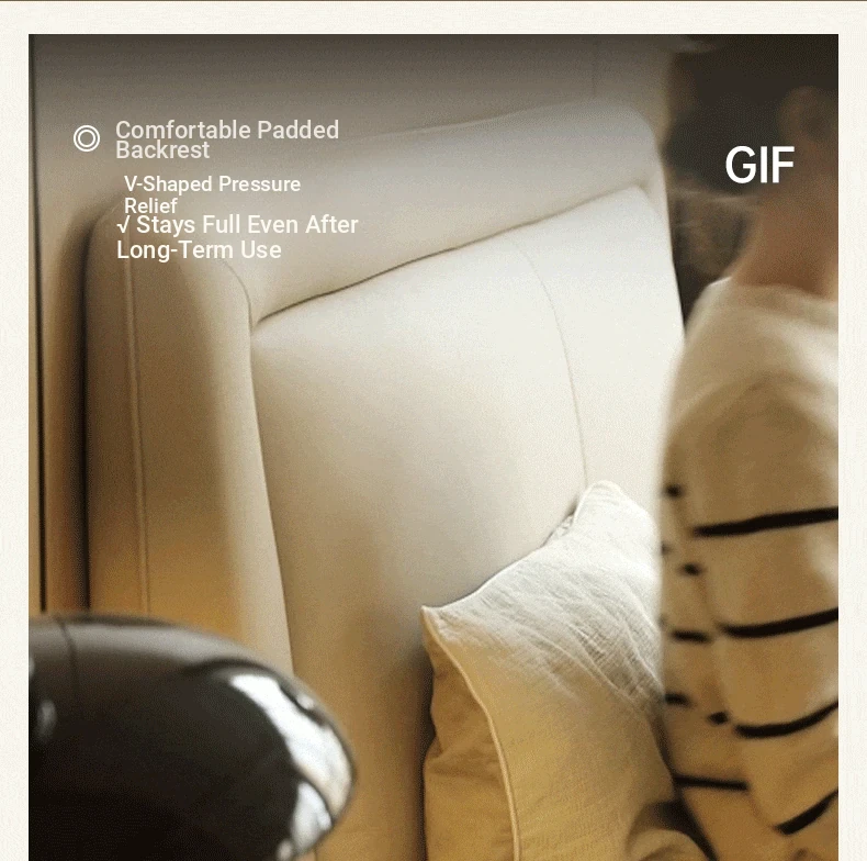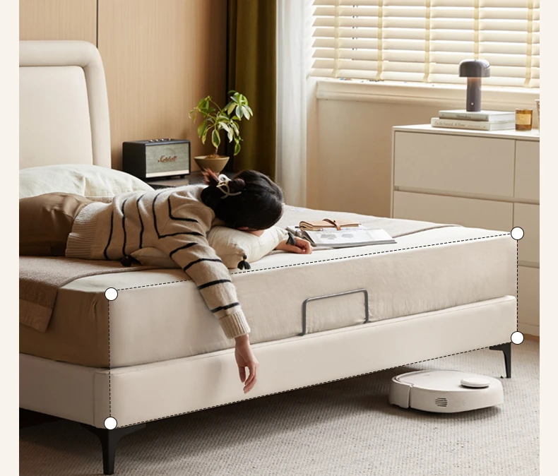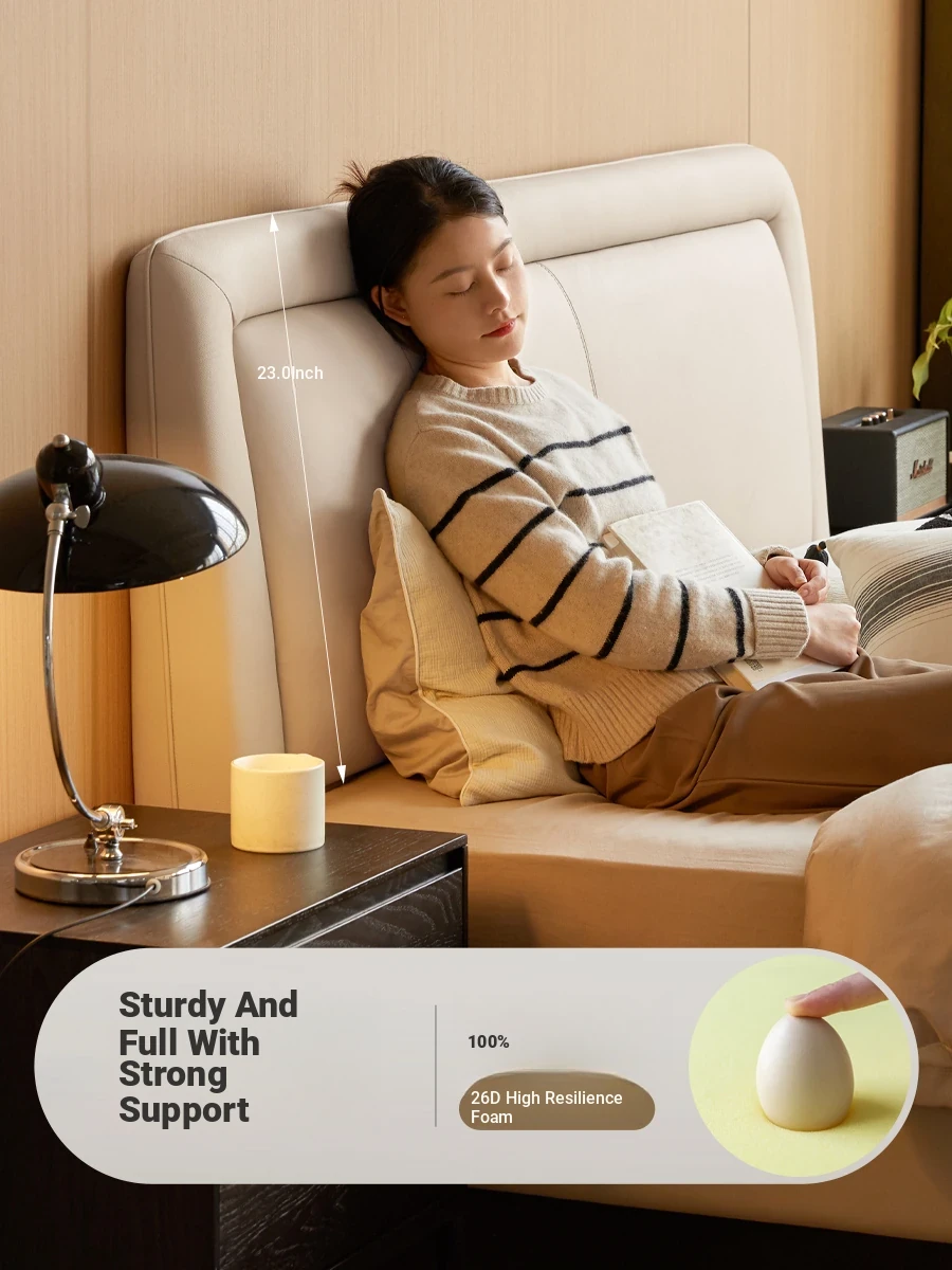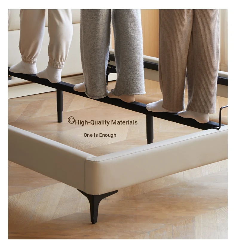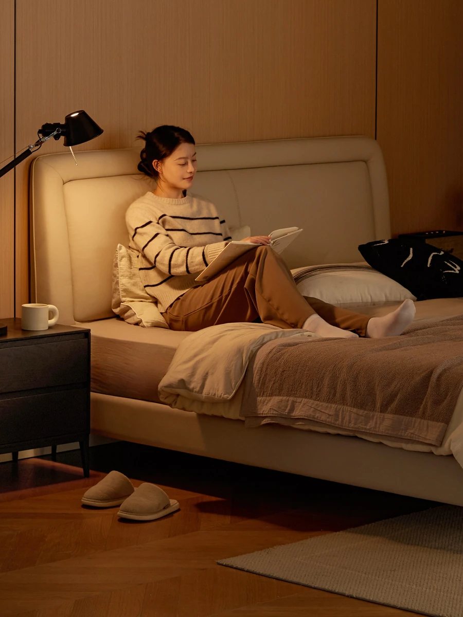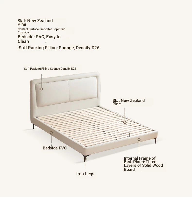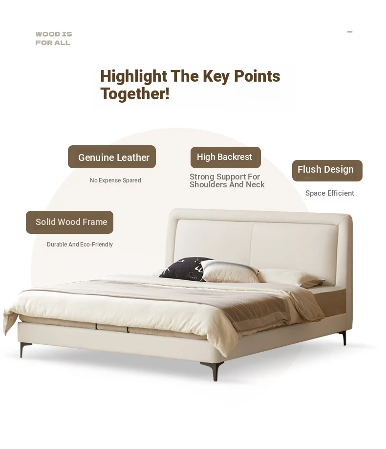 Genji Mu Yu Genuine Leather Modern Minimalist Queen Bed – Cream Upholstered Bed with White Border, Cowhide Double Bed for Stylish Bedrooms