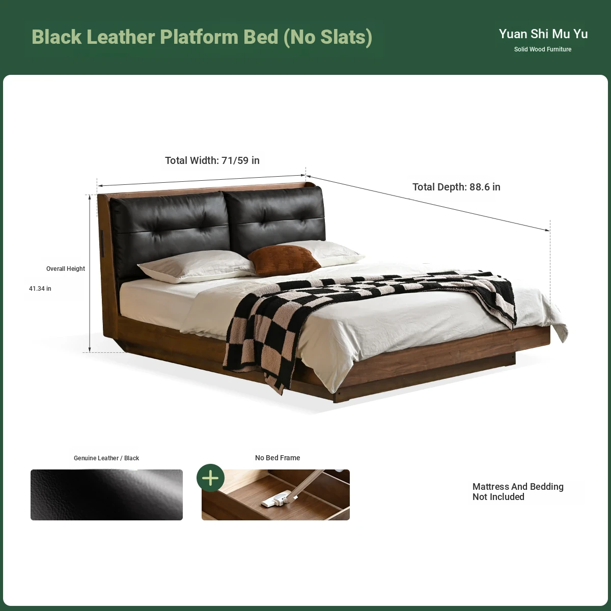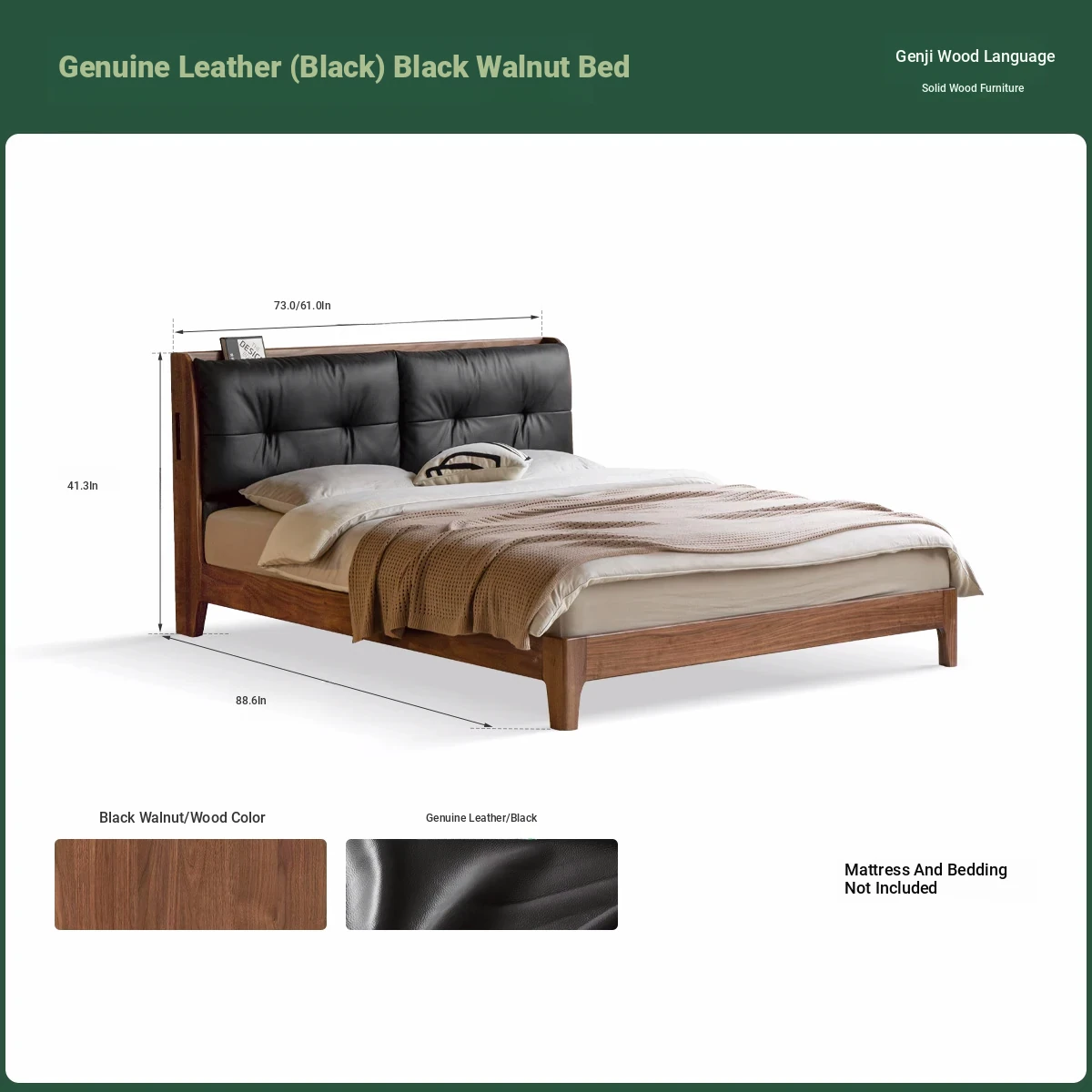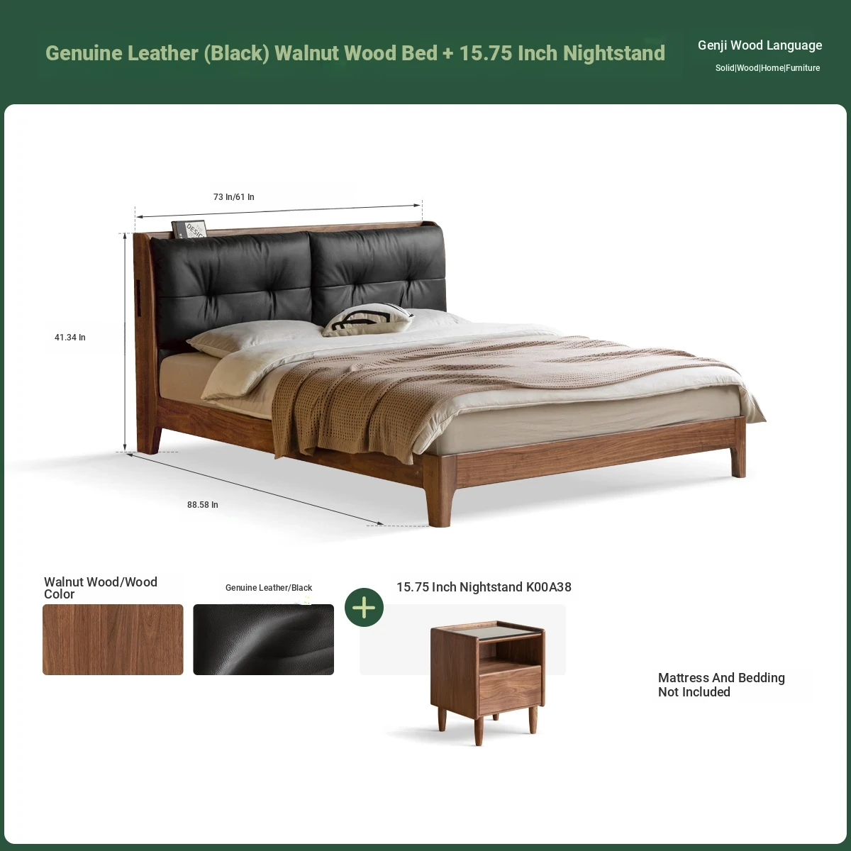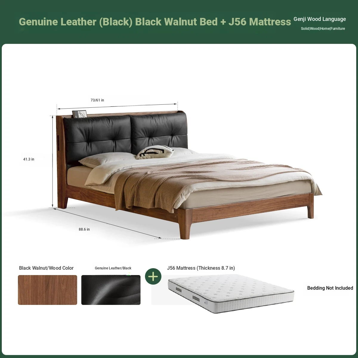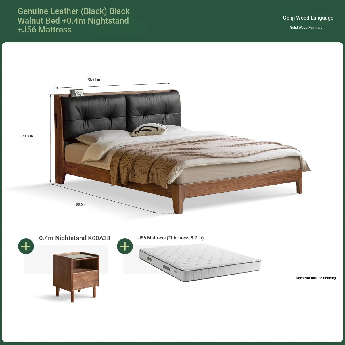 (Nanyang Golden sandalwood walnut color) leather (black) black walnut bed + mattress (8.66in thick J56 hard H2)+15.75 in bedside table (00A38)