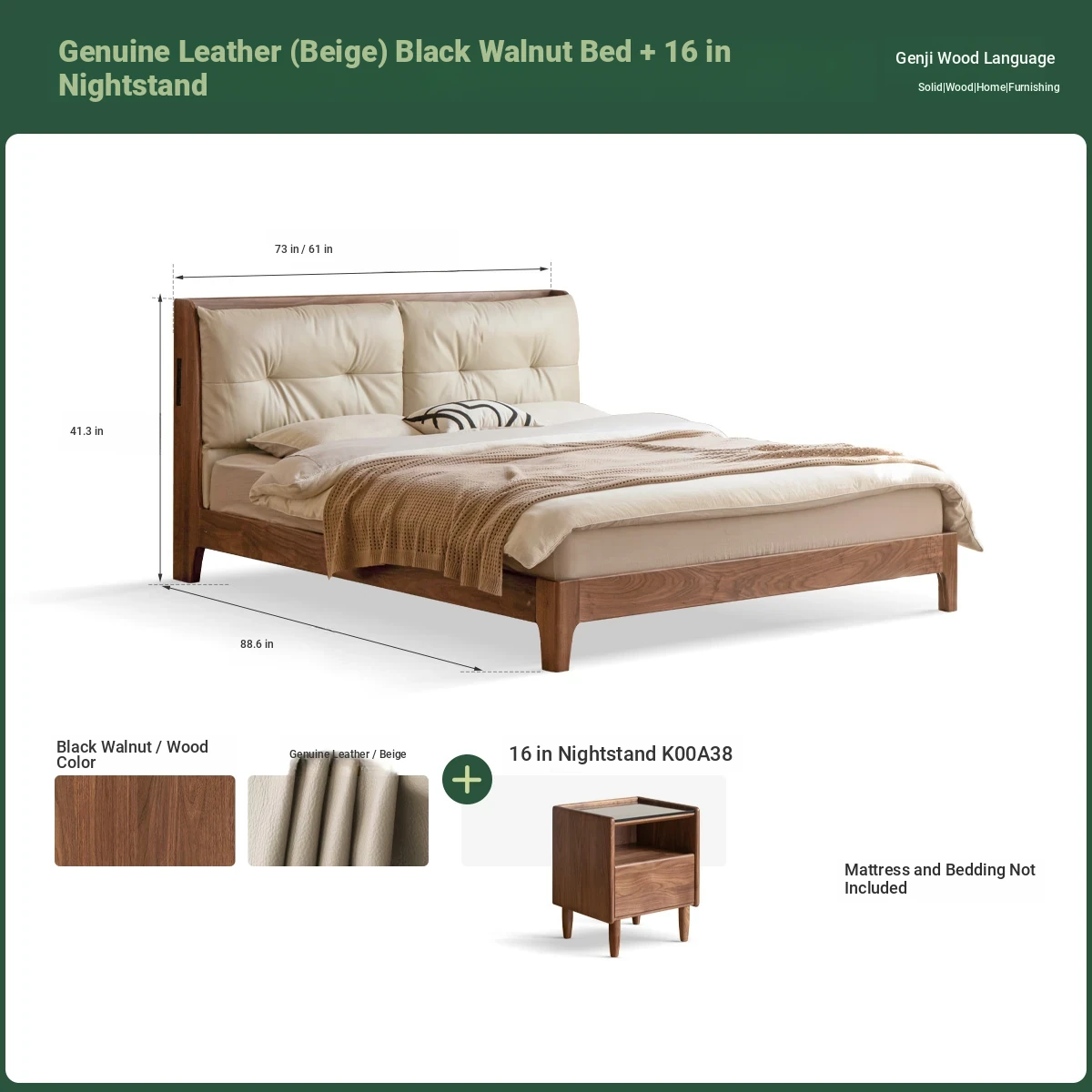 (9) leather (rice White) black walnut bed + mattress (8.66in thick J56 hard H2)+15.75 in bedside table (K00A38)K00B154