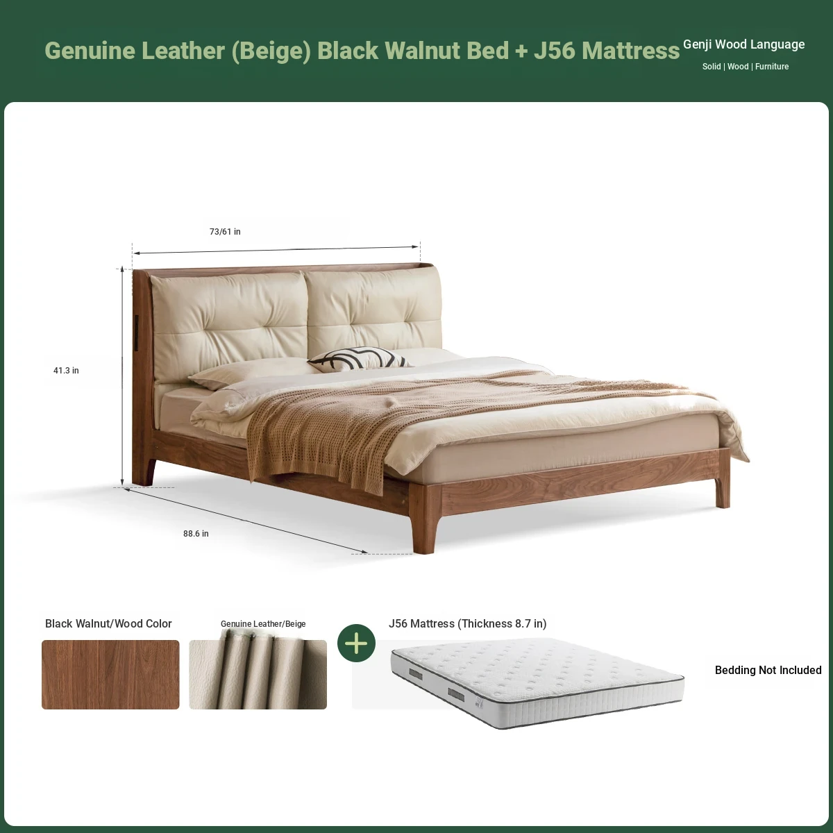 (4) leather (rice White) black walnut bed + mattress (8.66in thick J56 hard H2)K00B154