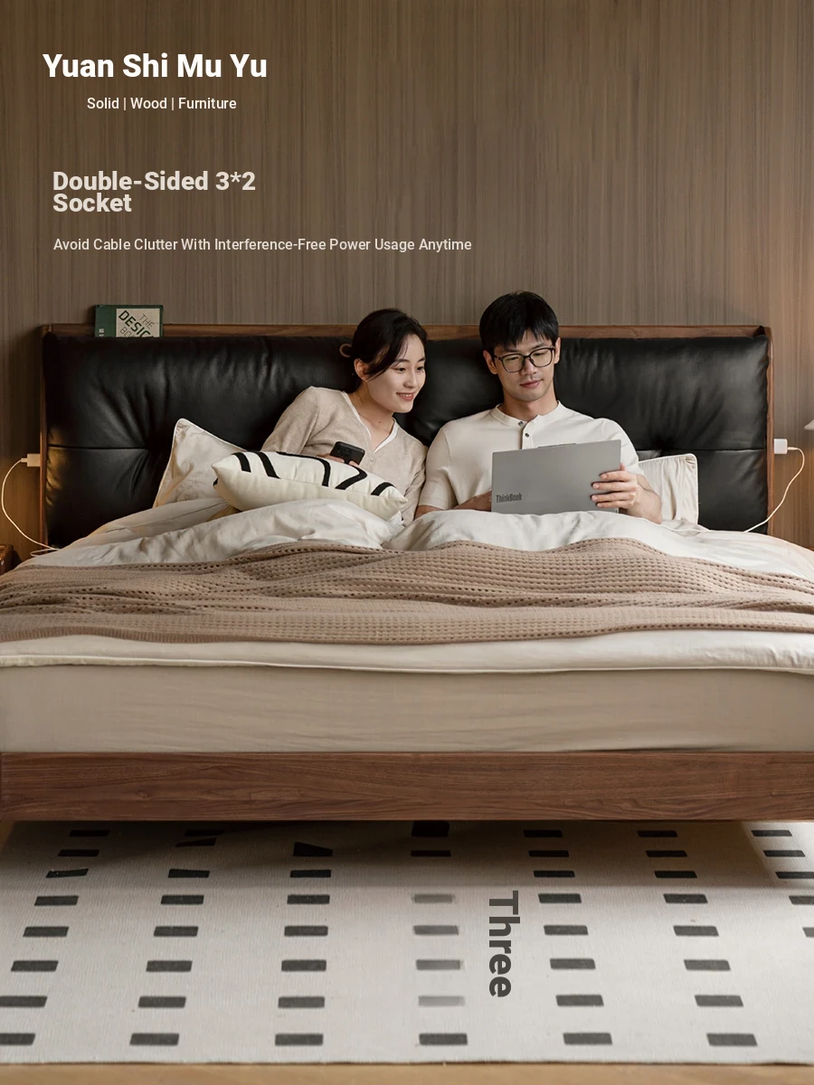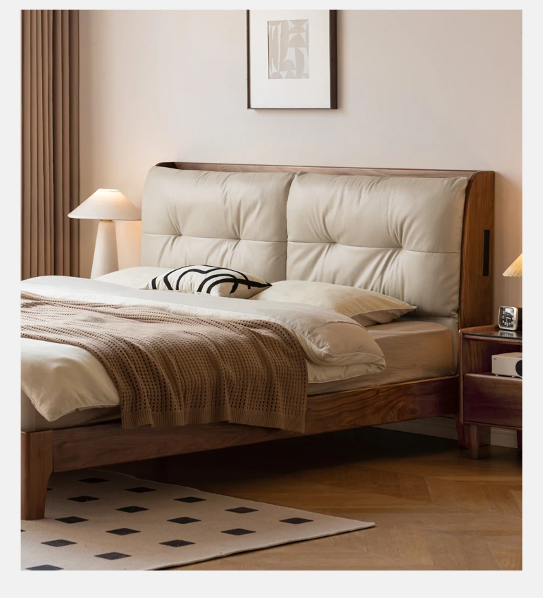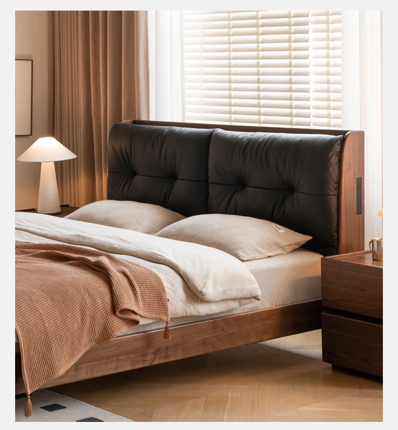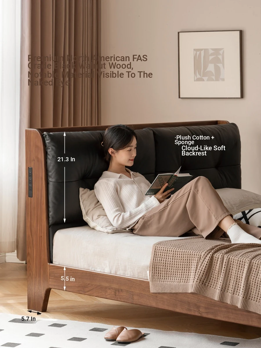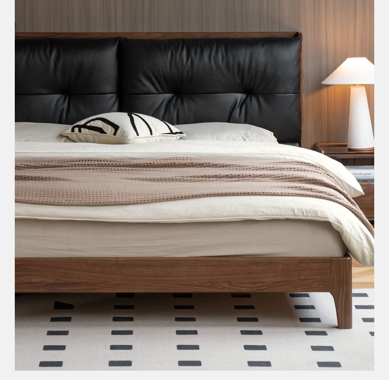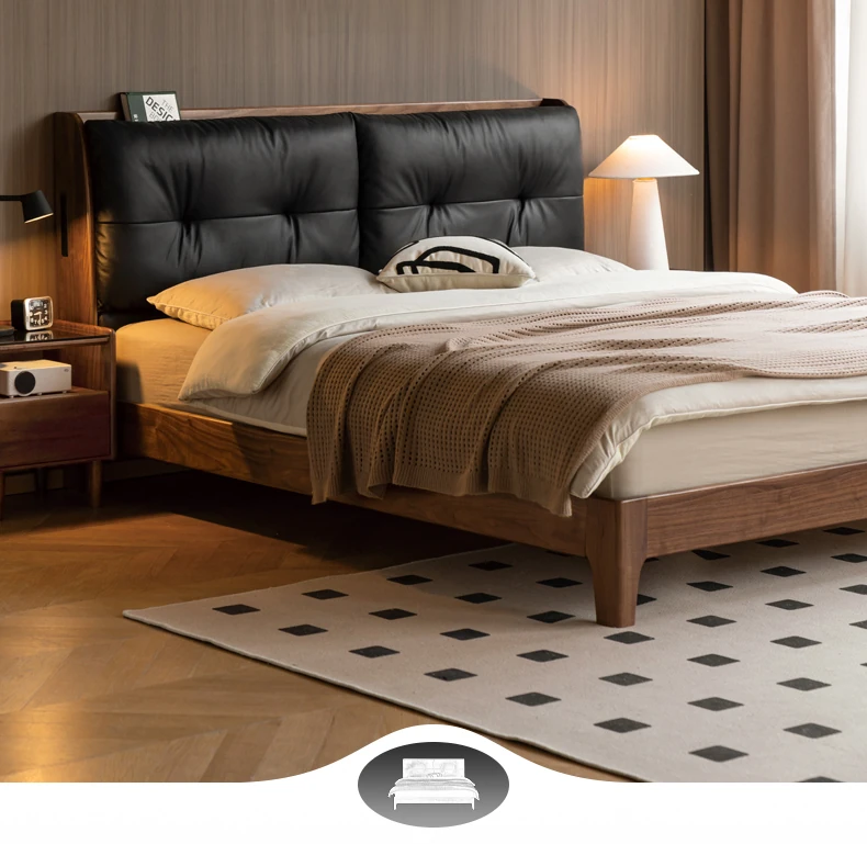 Genji Mu Yu Solid Wood Bed with Leather Upholstered Headboard – Minimalist Black Walnut Double Bed for Bedroom, Luxurious Yet Affordable Home King Size Bed