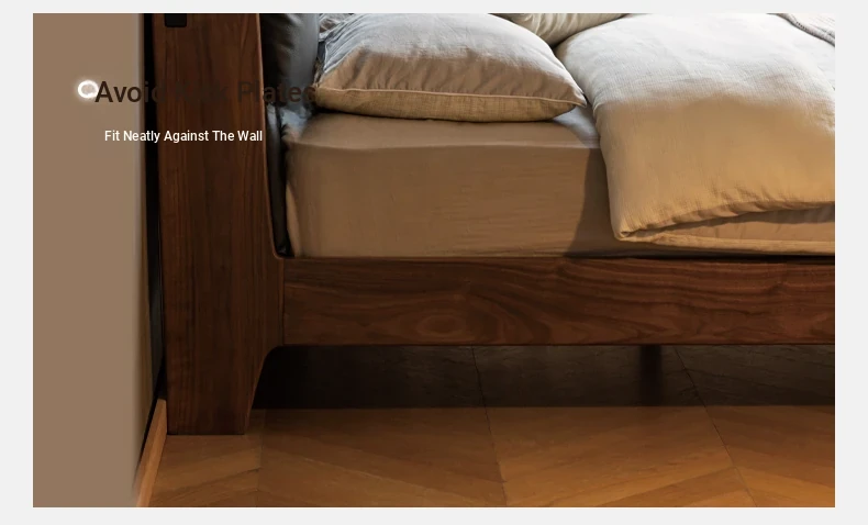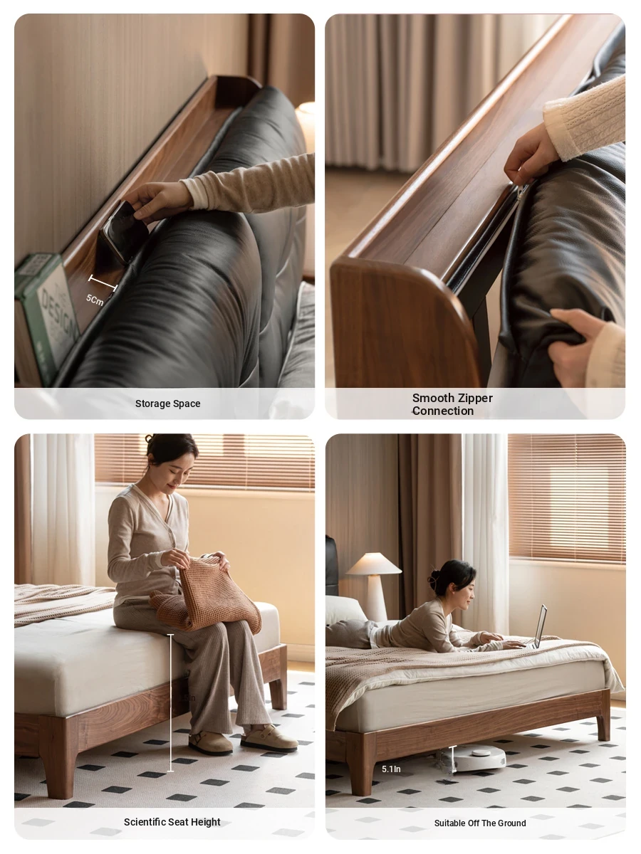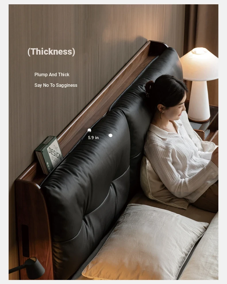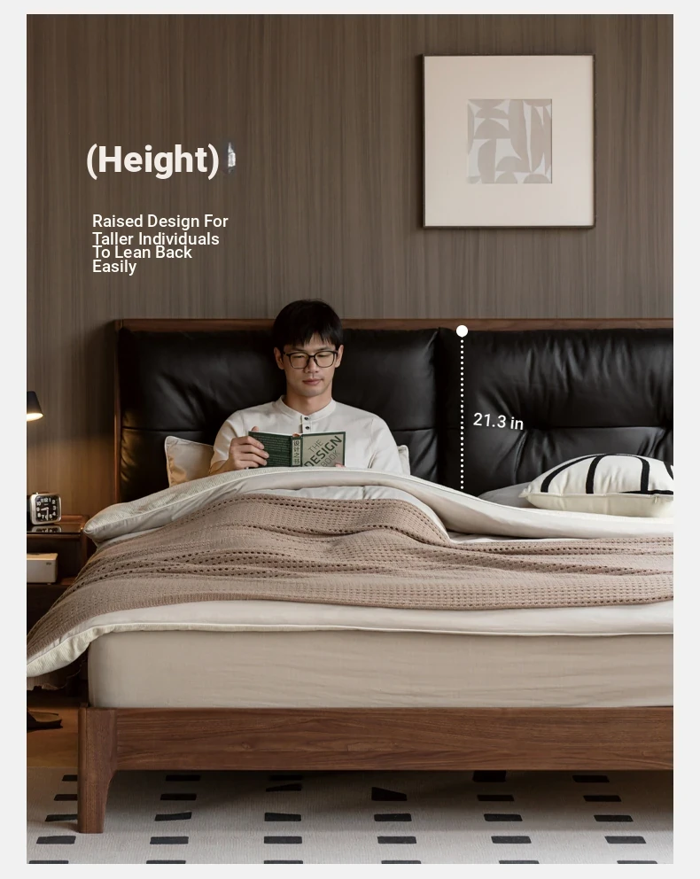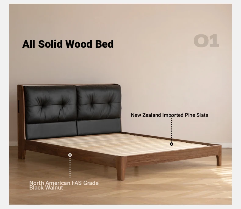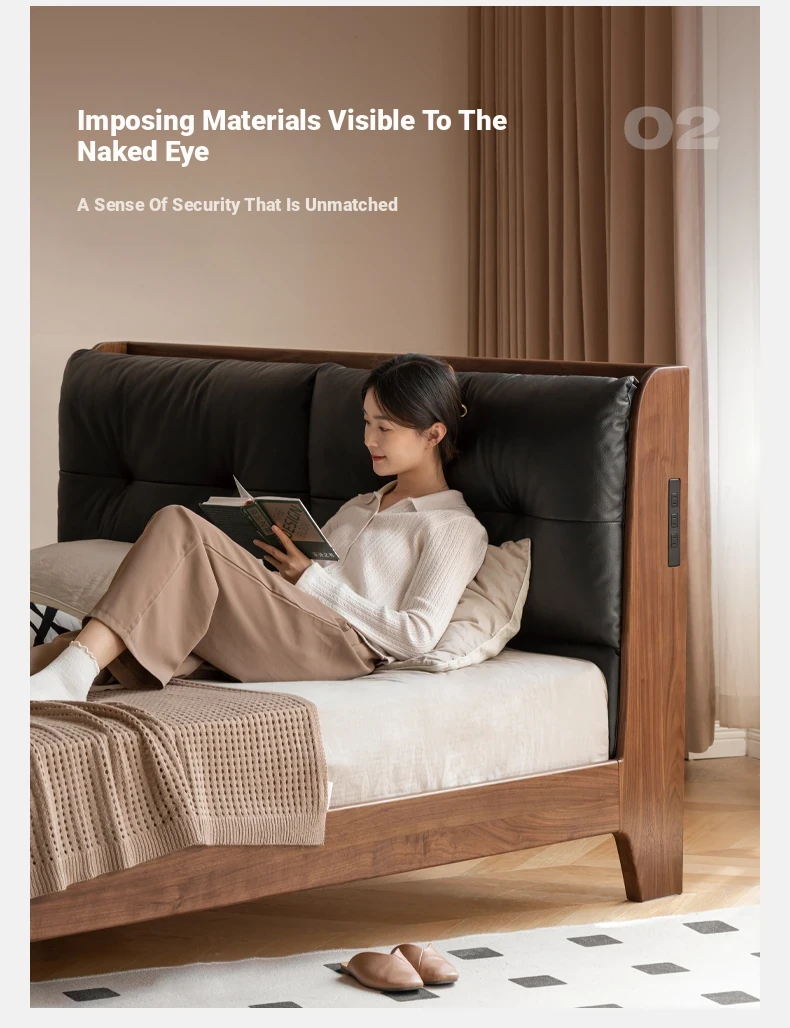Genji Mu Yu Solid Wood Bed with Leather Upholstered Headboard – Minimalist Black Walnut Double Bed for Bedroom, Luxurious Yet Affordable Home King Size Bed