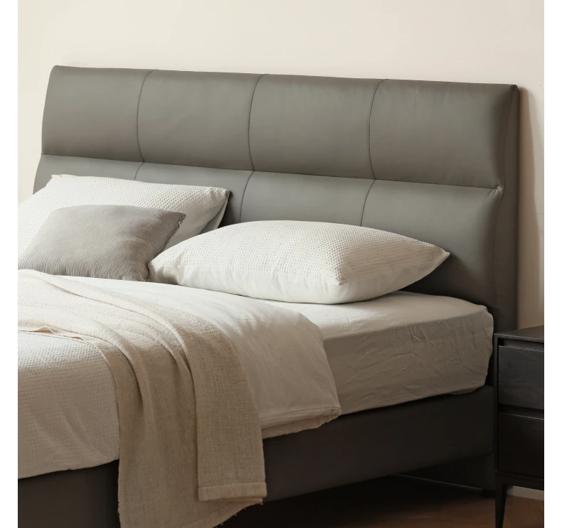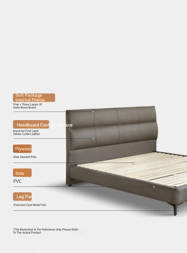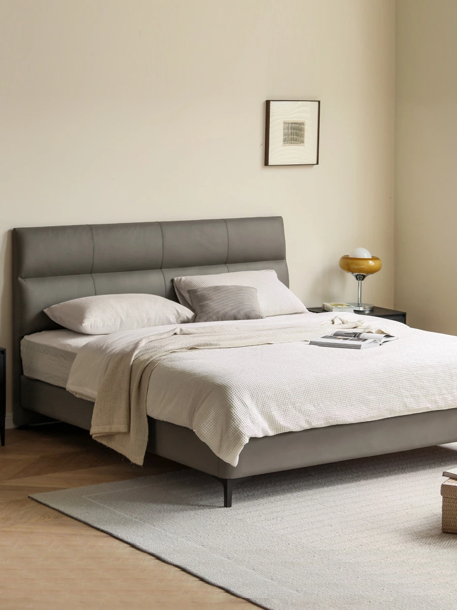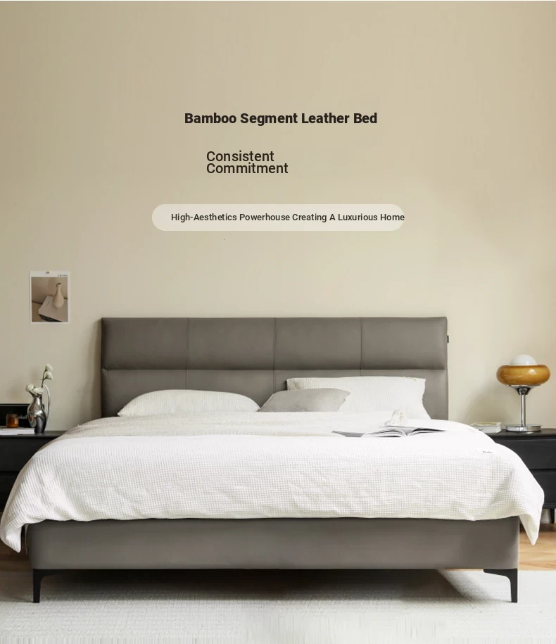 "Genji Wood Gray Genuine Leather Bed - Modern Minimalist King Size Double Bed with Luxurious Soft Upholstered Headboard, Premium Cowhide for Your Master Bedroom"