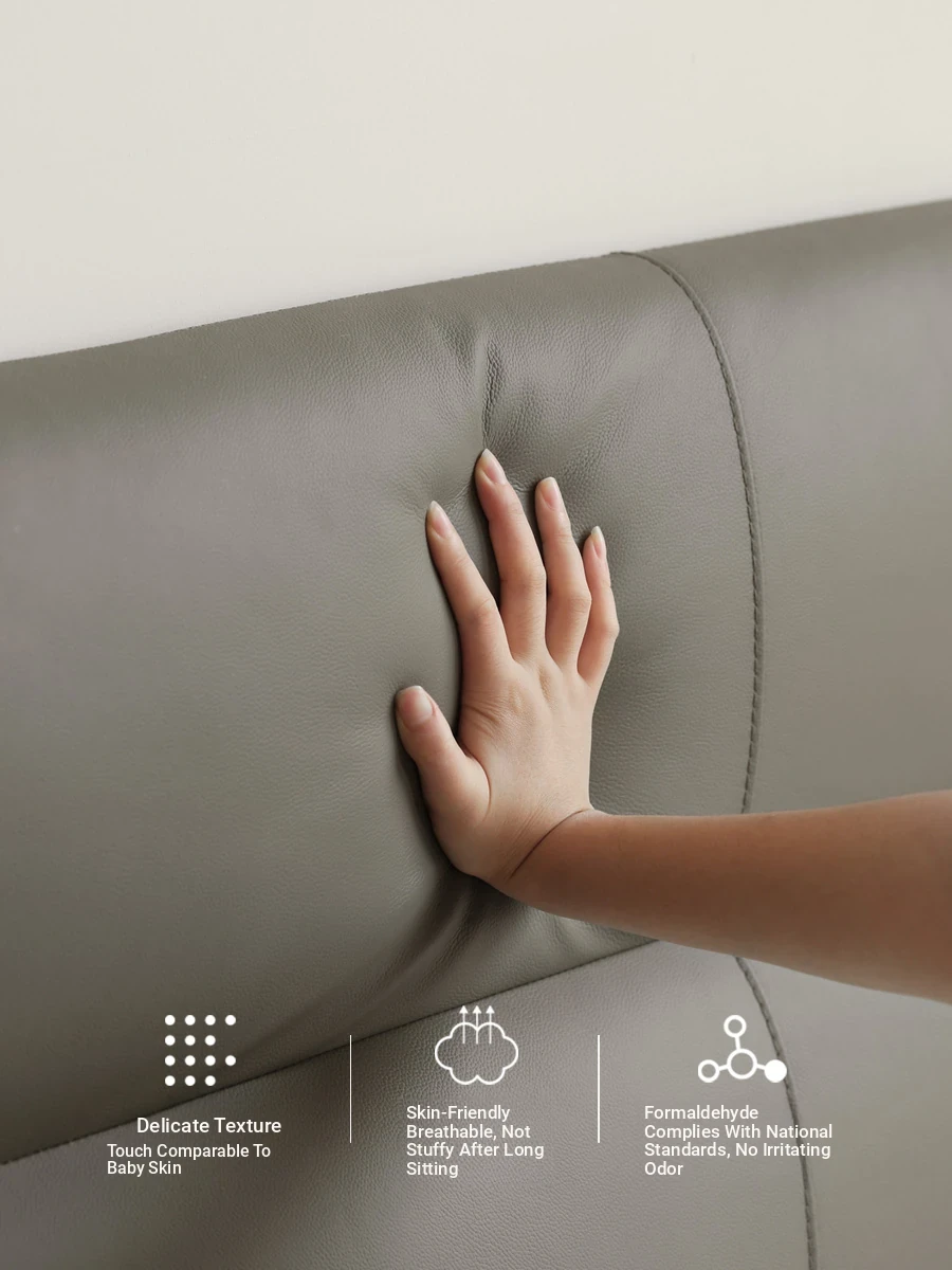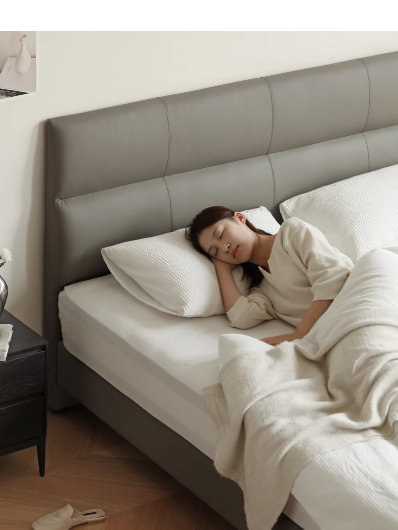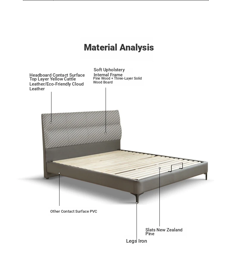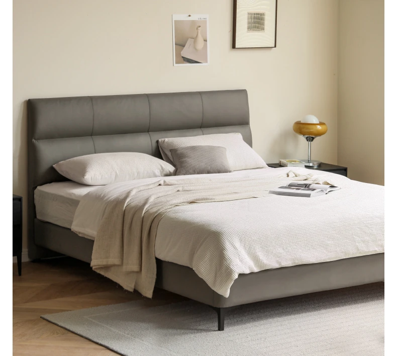 "Genji Wood Gray Genuine Leather Bed - Modern Minimalist King Size Double Bed with Luxurious Soft Upholstered Headboard, Premium Cowhide for Your Master Bedroom"