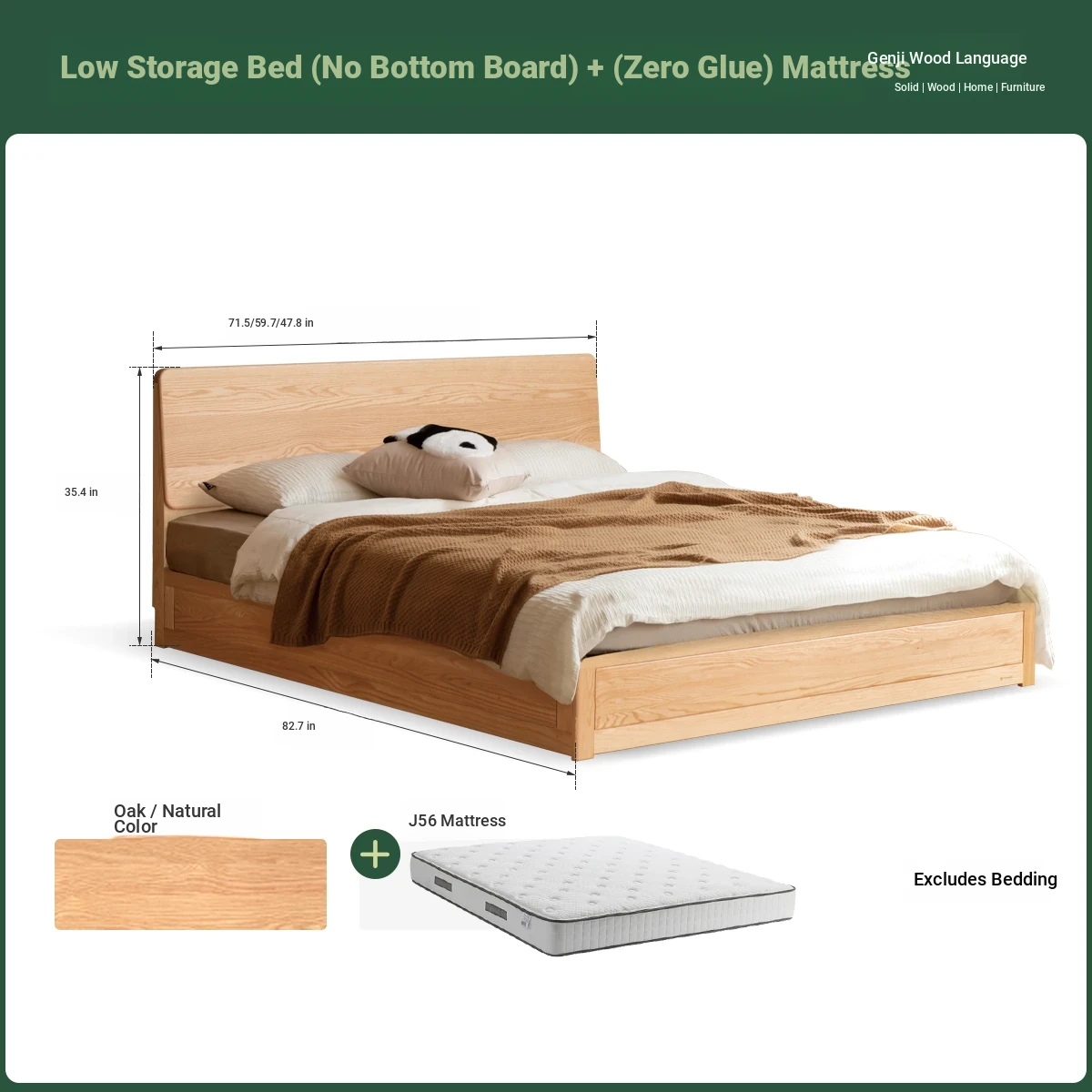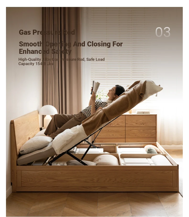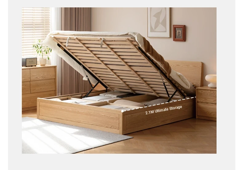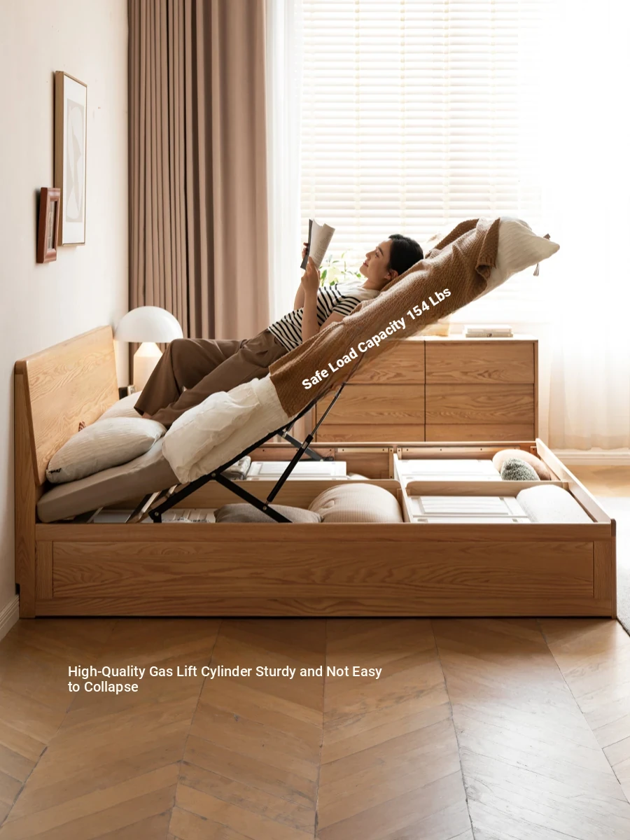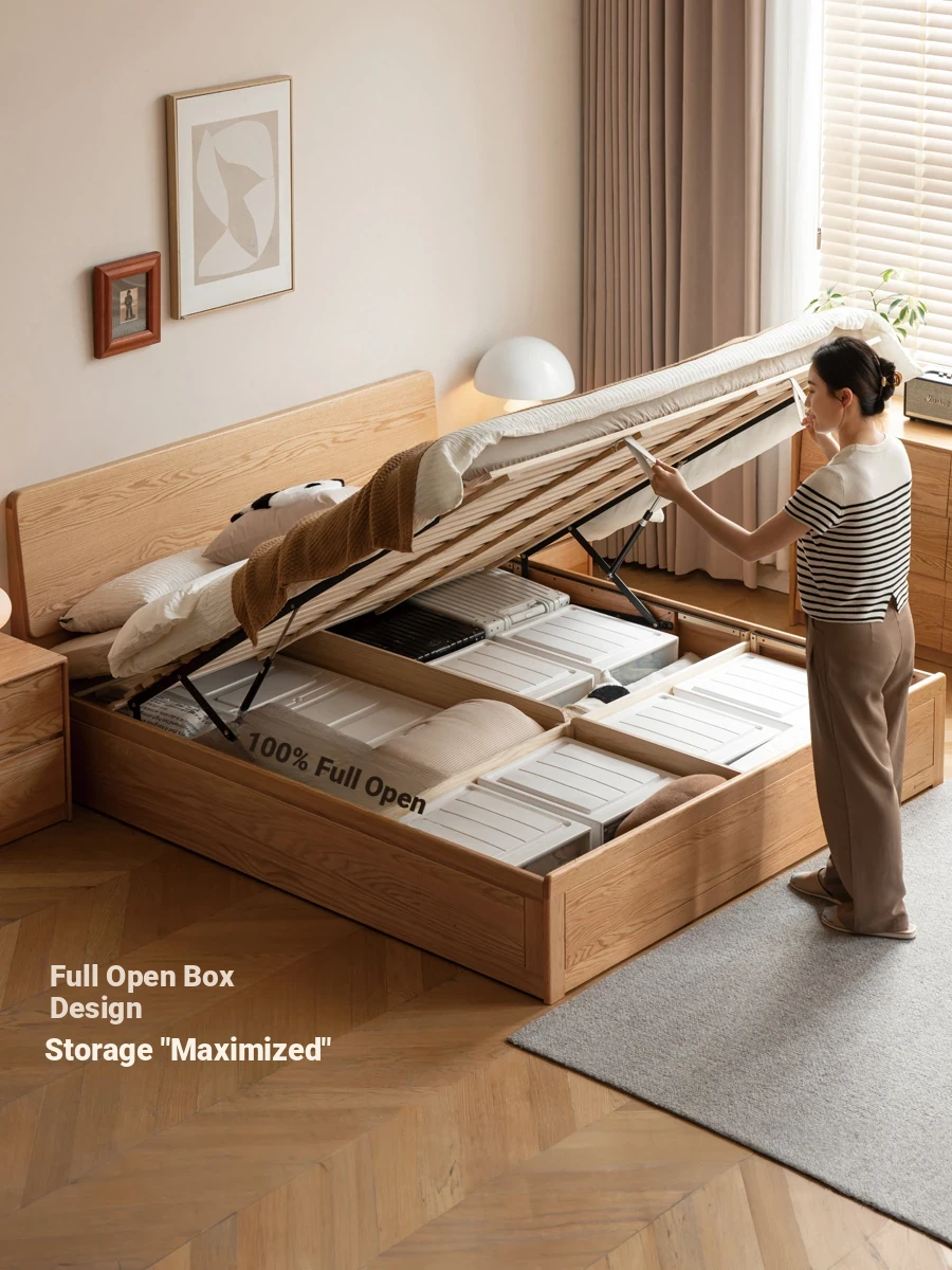 Genji Wood Simple Solid Wood Bed - Minimalist Design for Bedrooms, Double-Sized Natural Oak Storage Bed with Gas Lift Mechanism, Perfect for Home Use